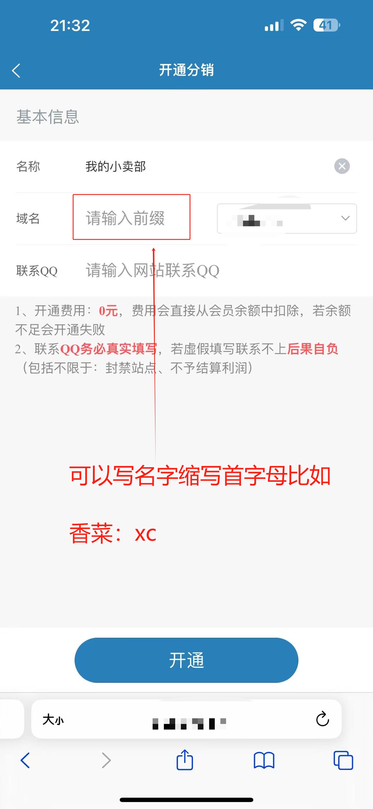 2.点击分销系统,填写相关信息开通